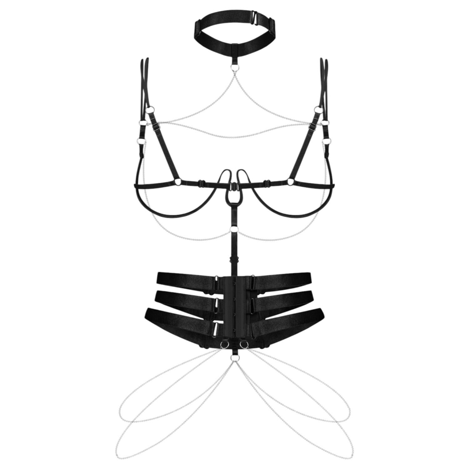 • Design extravagant – collier, soutien-gorge à bonnets ouverts et ceinture en un, décoré de chaînes argentées.