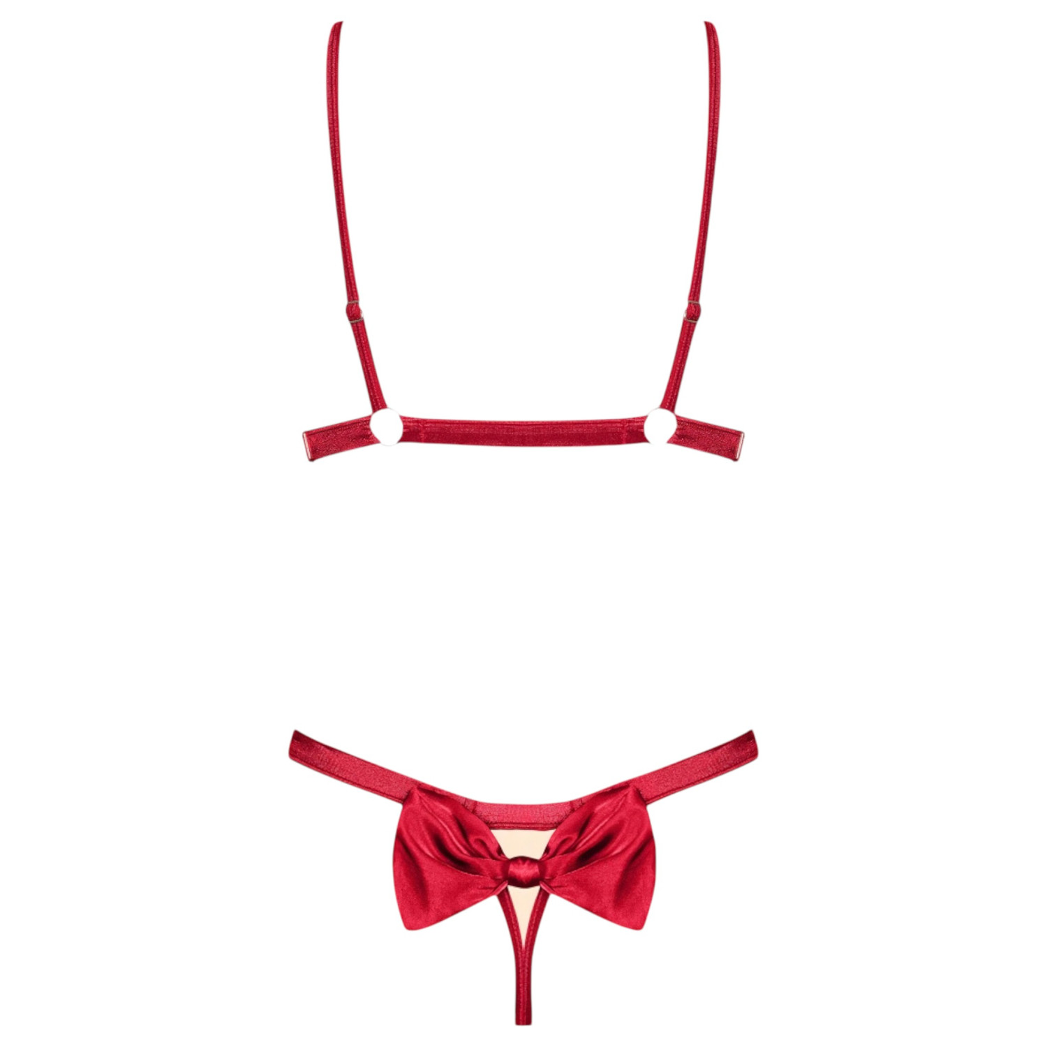 Le set Obsessive Rubinesa est une lingerie sensuelle et élégante, réalisée en satin rouge brillant avec des touches dorées, et un design ouvert rehaussé de jolis nœuds.
