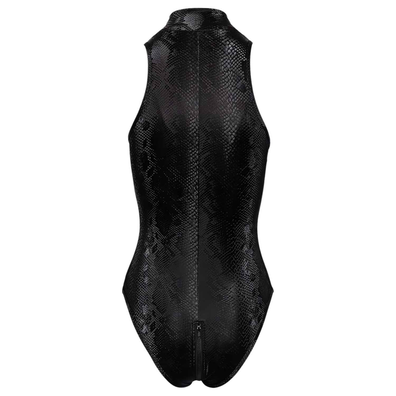 Body effet peau de serpent avec col montant et fermeture éclair à double sens, qui va du col jusqu’aux fesses ! Avec son fini soyeux et son motif serpent, tu seras juste irrésistible et pleine de mystère !