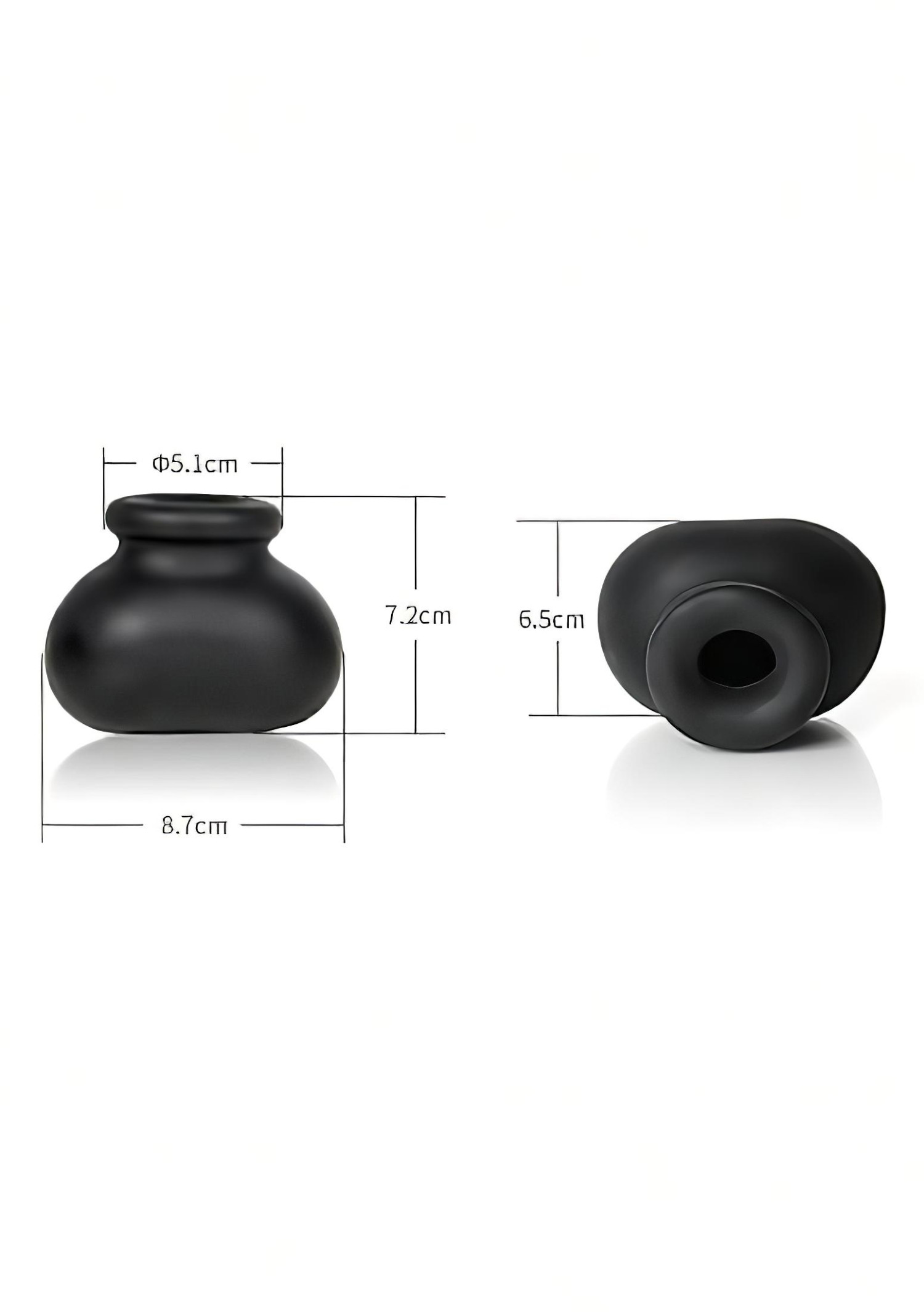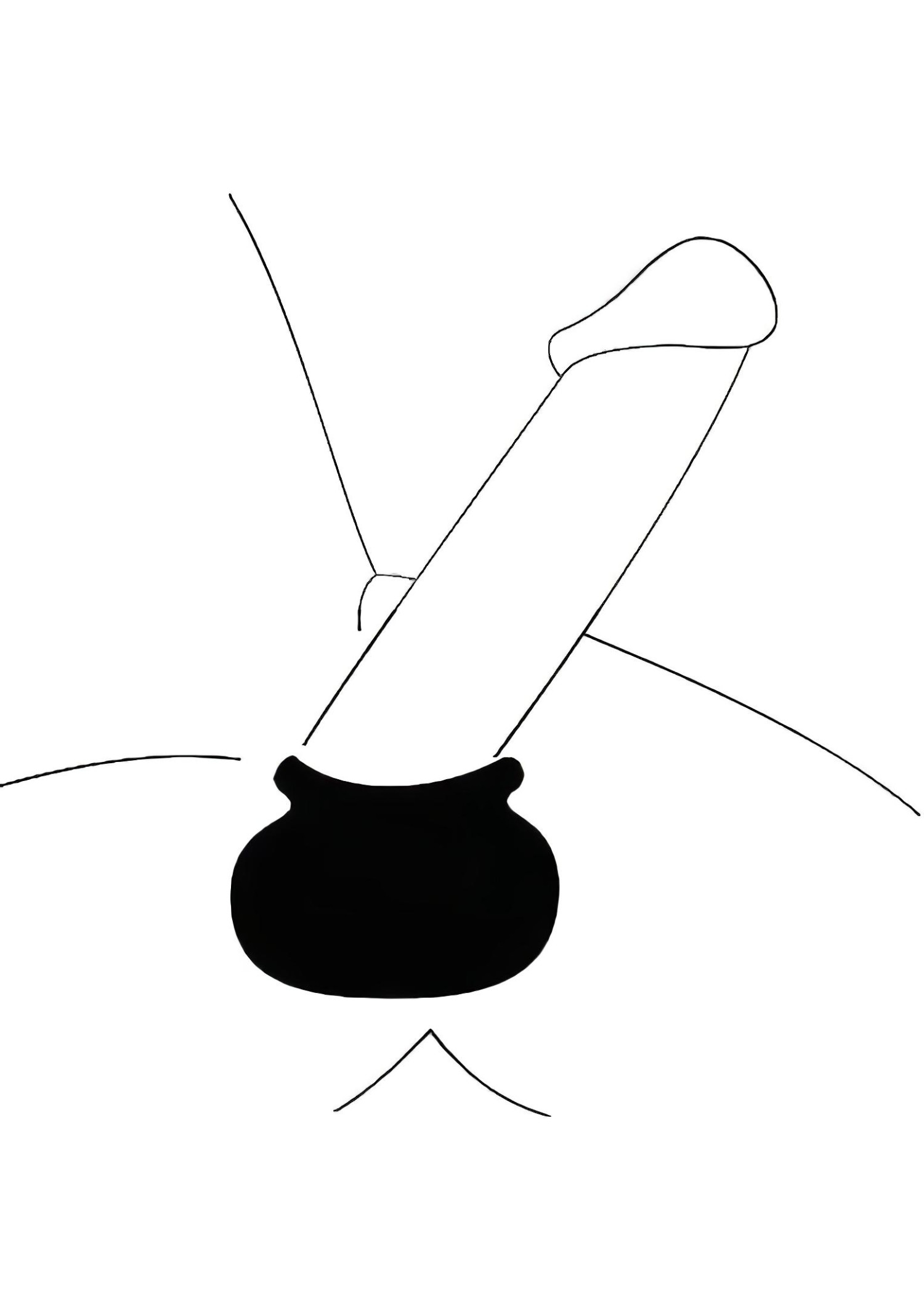Écarte l’ouverture avec tes doigts ou par le bord, puis glisse-le doucement autour de ton scrotum jusqu’à ce qu’il soit bien en place. Grâce à sa forme de pichet, il exerce une légère pression tout en offrant une sensation agréable et maintient les testicules tirés vers le bas.