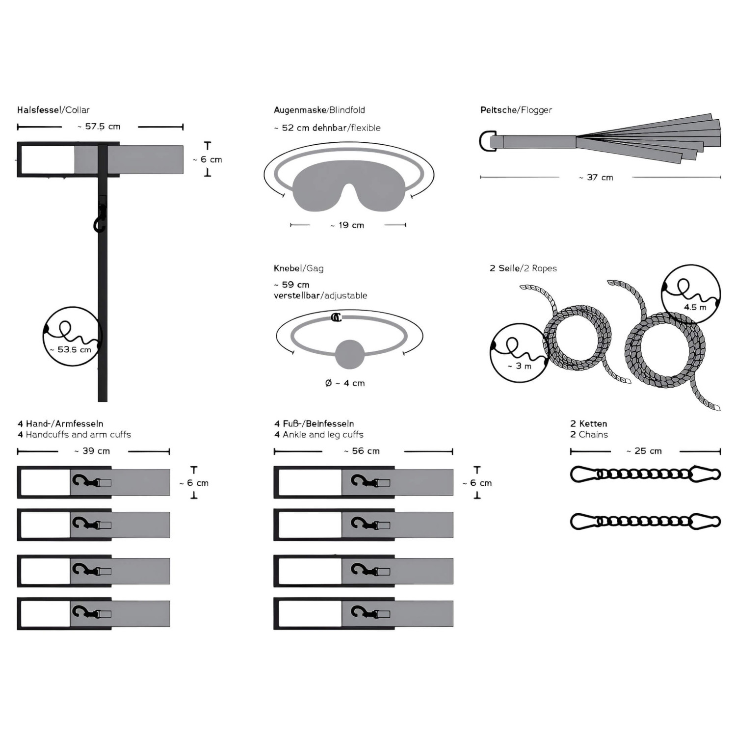 • Accessoires polyvalents - menottes, masque pour les yeux, mini-fouet et corde de bondage.