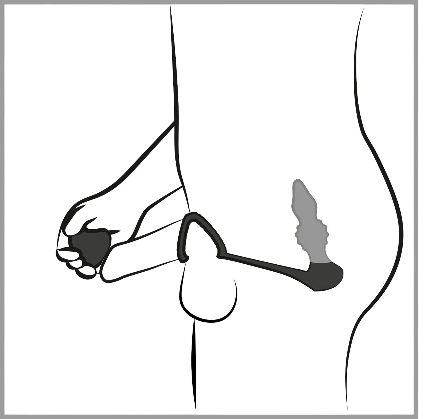 • Commence par lubrifier légèrement ton pénis puis, en semi-érection ou totalement dur, glisse d’abord à moitié le cockring ; ensuite, lubrifie bien ton anus et le vibro anal. Une fois prêt, insère doucement le vibro dans ton anus (attention, la partie centrale est plus large et d’une texture différente), puis ajuste la bague à la base du pénis avec l’autre main. Passe enfin l’anneau testiculaire derrière tes testicules pour vraiment tout maintenir en place !