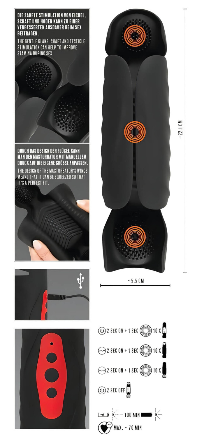Applique du lubrifiant sur ton pénis ainsi que sur la partie interne du jouet, puis place le masturbateur sur ton membre. Allume les vibrations à l’aide des boutons, choisis ton mode préféré et profite d’un plaisir unique grâce à toutes les options de vibrations. Les ailettes flexibles tiennent fermement ton sexe, pendant que les points et rainures massent intensément.