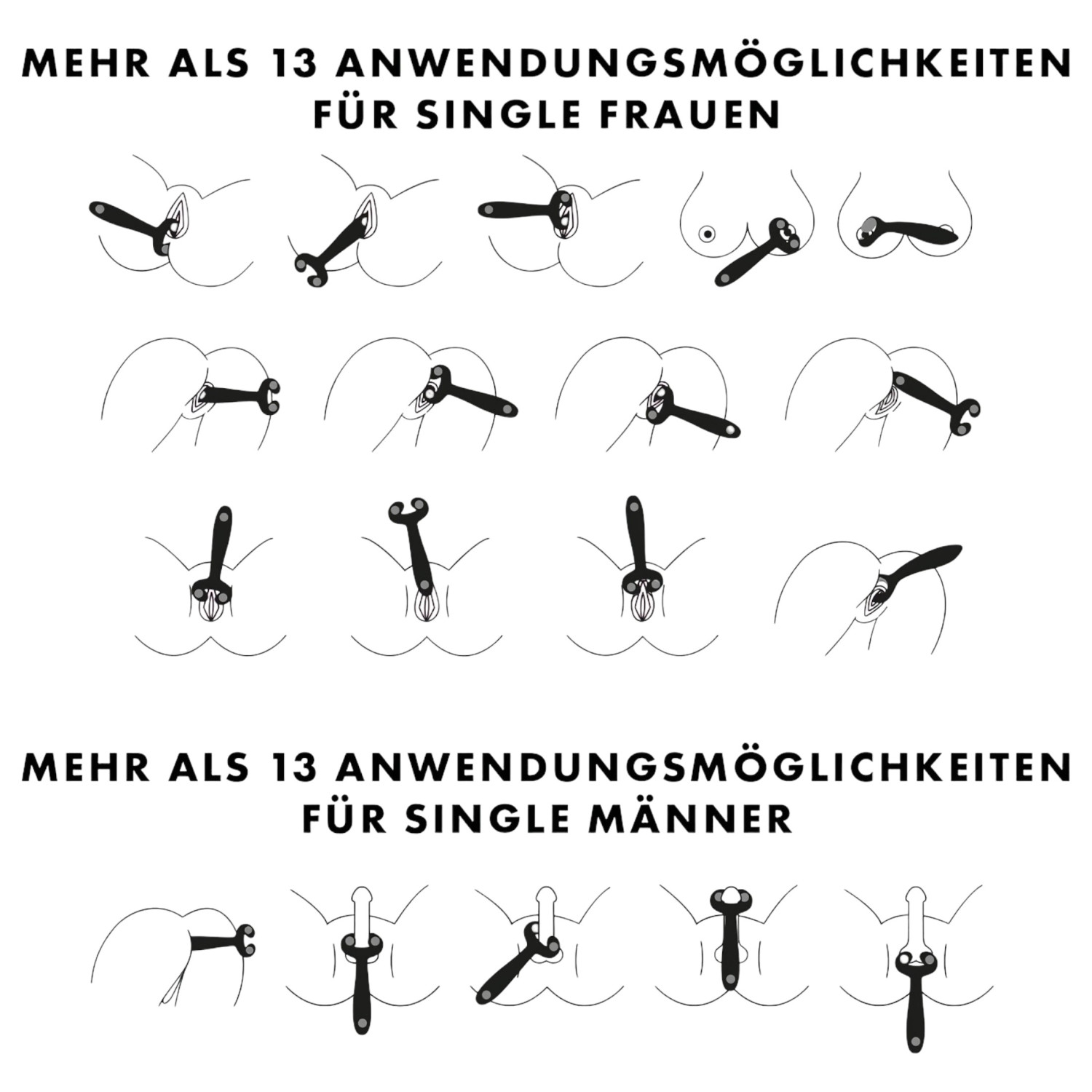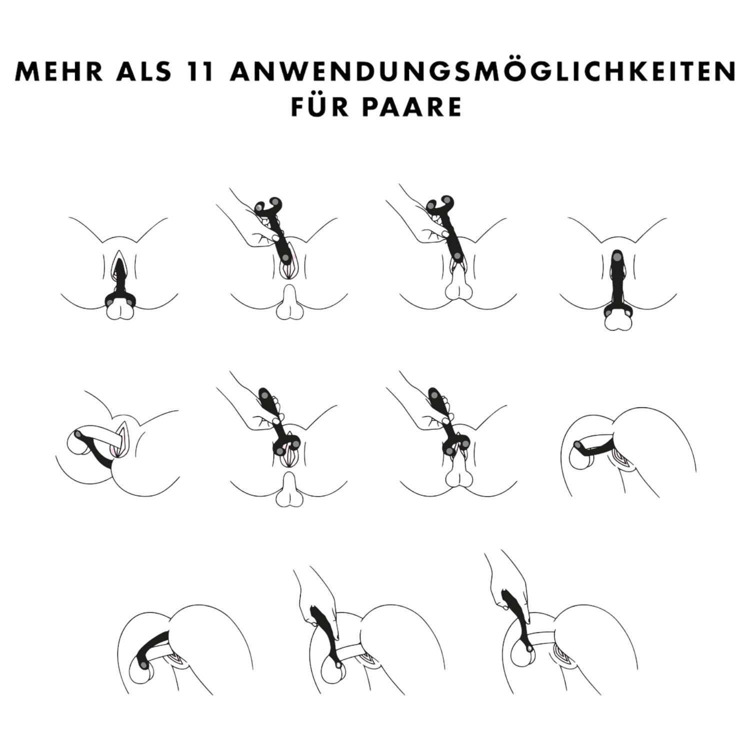 Place le pénis entre les deux bras flexibles et fais des mouvements de va-et-vient, vibrations activées. Tu peux aussi l’utiliser pour stimuler le clitoris, les mamelons, le vagin, comme anneau pénien ou encore sur le clito ou les testicules pendant l’amour à deux. D’autres idées sur les illustrations de la boîte !