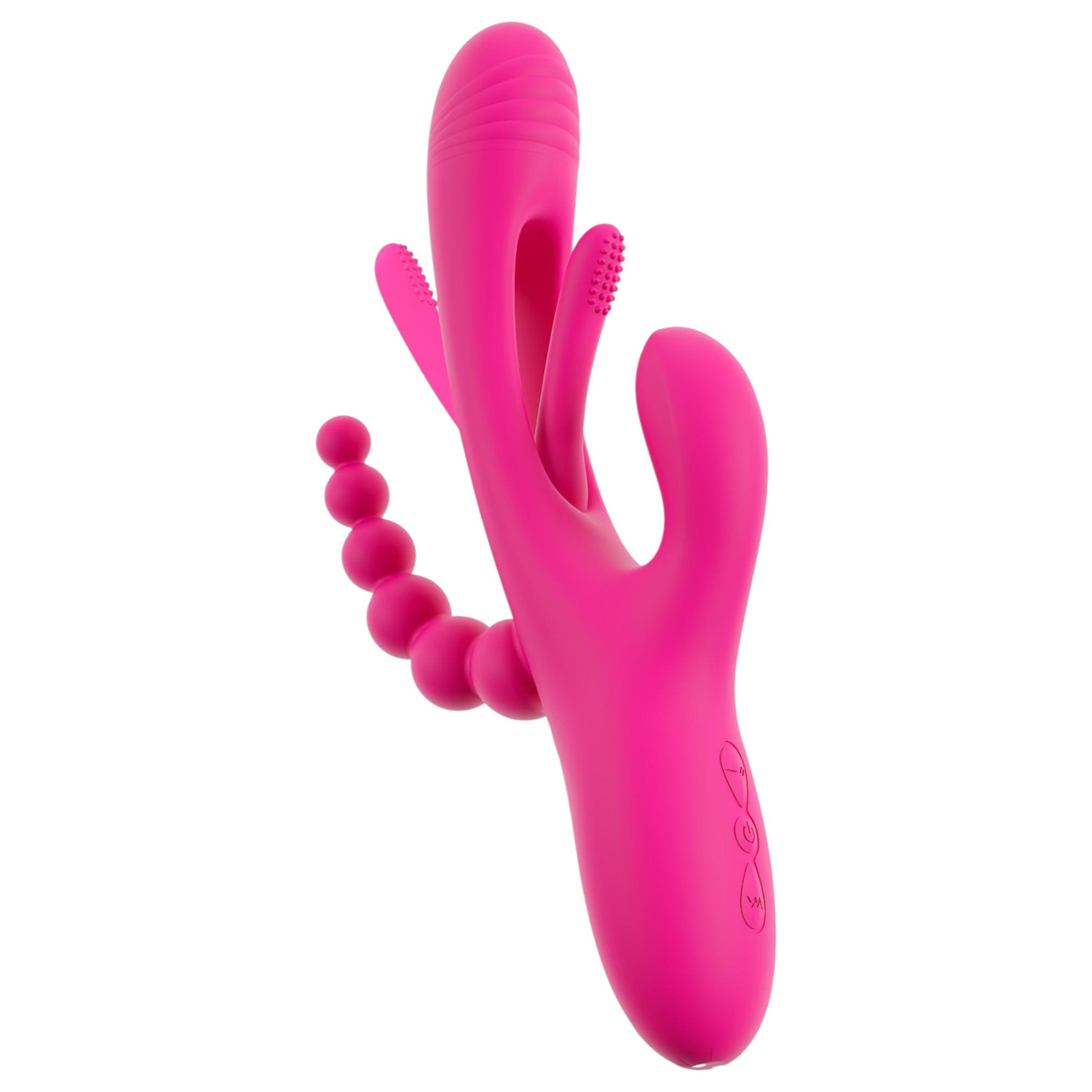 Découvre le plaisir triple avec ce vibromasseur ergonomique qui stimule en même temps le vagin, le clitoris et la zone anale !