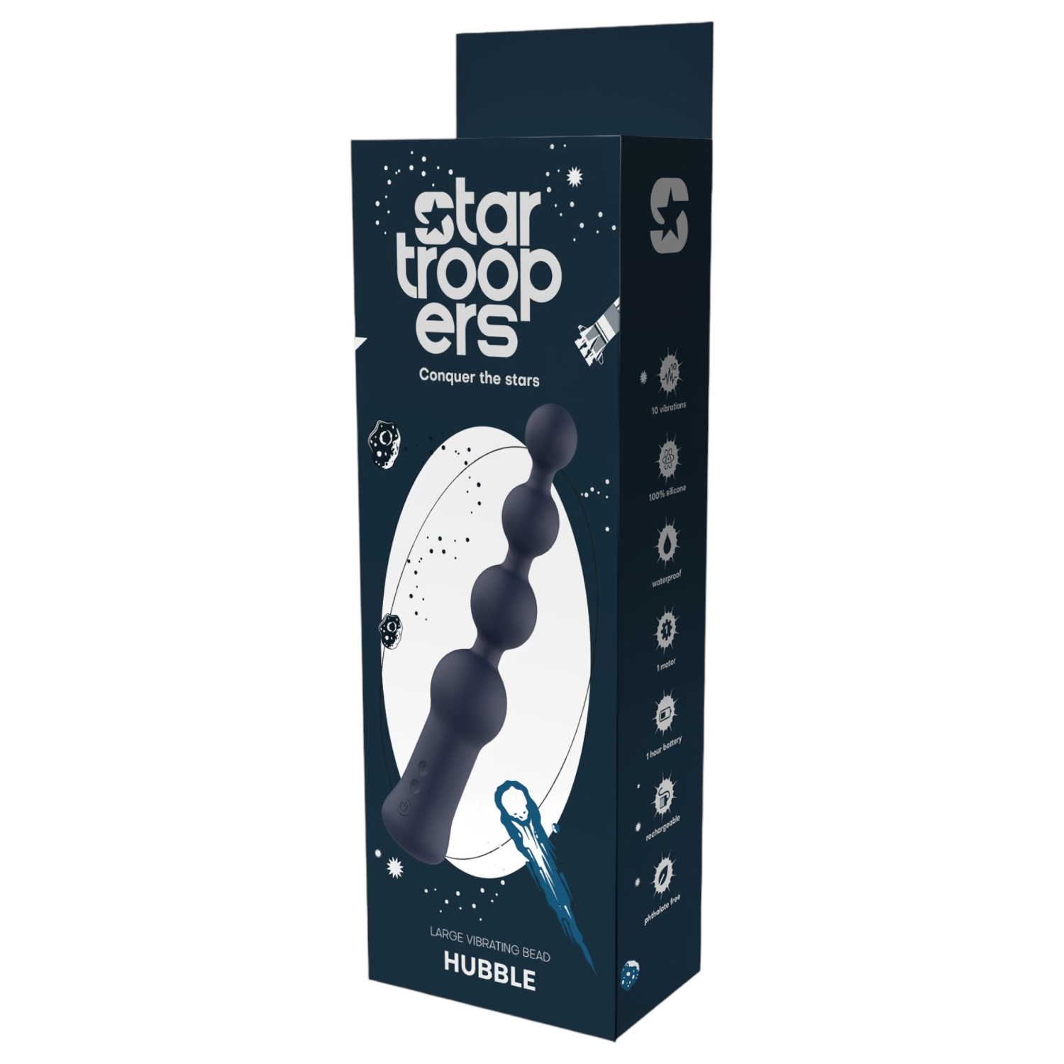 Le plug anal vibrateur Hubble de Startroopers est équipé de perles spéciales dont la taille augmente progressivement, pour des sensations toujours plus intenses à chaque utilisation.