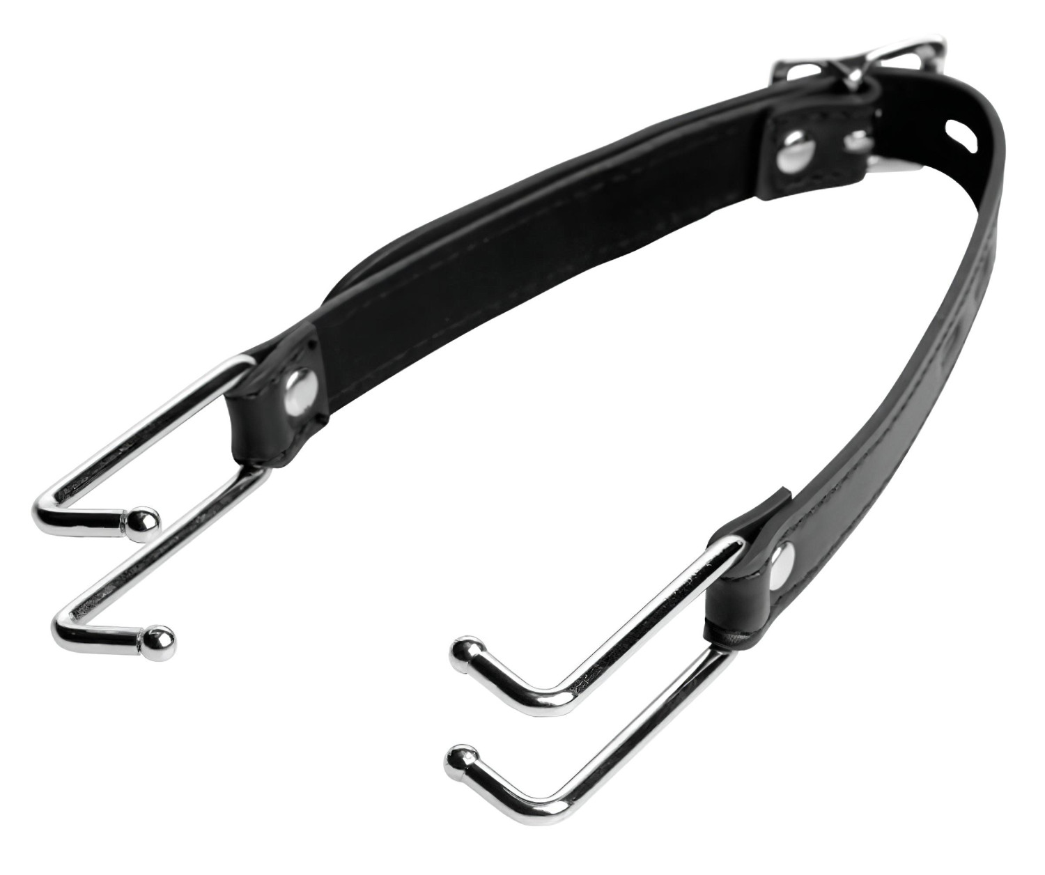 Place les crochets aux extrémités de la bouche, puis tends la sangle jusqu’à ce que les lèvres soient complètement écartées. Utilise la boucle de verrouillage pour fixer le tout à la position voulue.