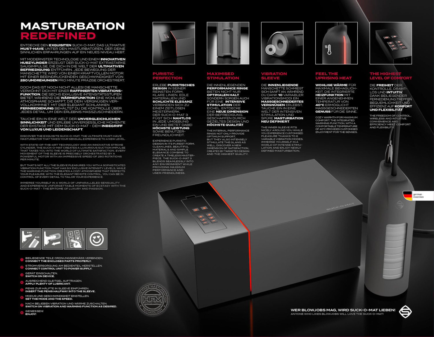 La Suck-O-Mat 3.0 est un masturbateur entièrement automatisé, fonctionnant sur secteur, qui offre une sensation ultra réaliste d'amour oral. Par rapport au modèle précédent, il propose une puissance d’aspiration doublée et un moteur nouvelle génération, avec un look élégant et sportif, et un éclairage LED.