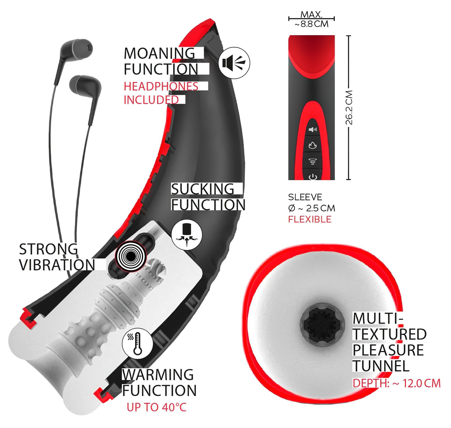Masturbateur pour homme vibrant et aspirant. Rechargeable, avec fonction chauffante : en plus des vibrations, il te régale aussi avec une sensation d’aspiration très agréable.