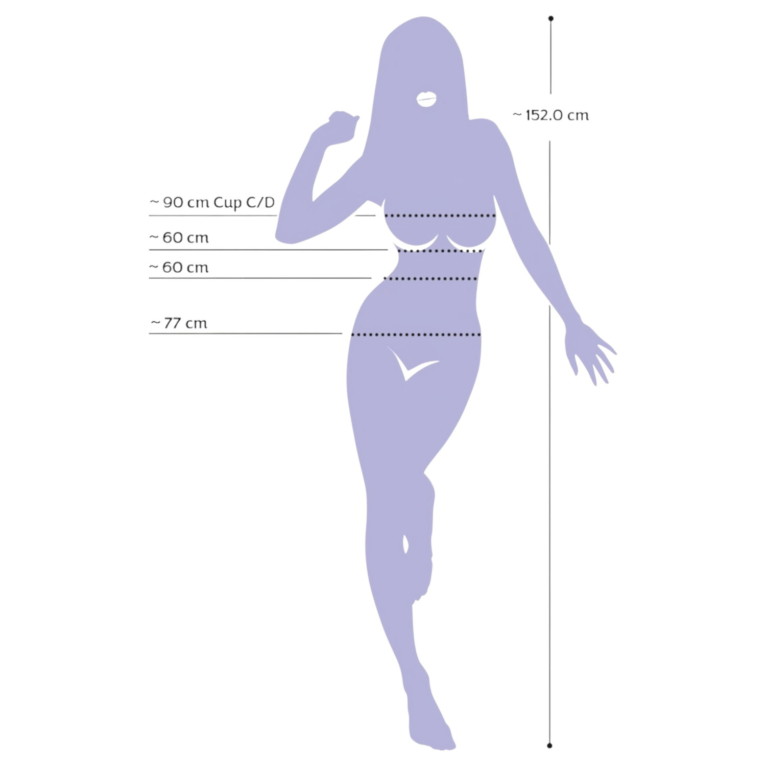 • Épaules : 90 cm, Taille : 60 cm, Hanches : 77 cm