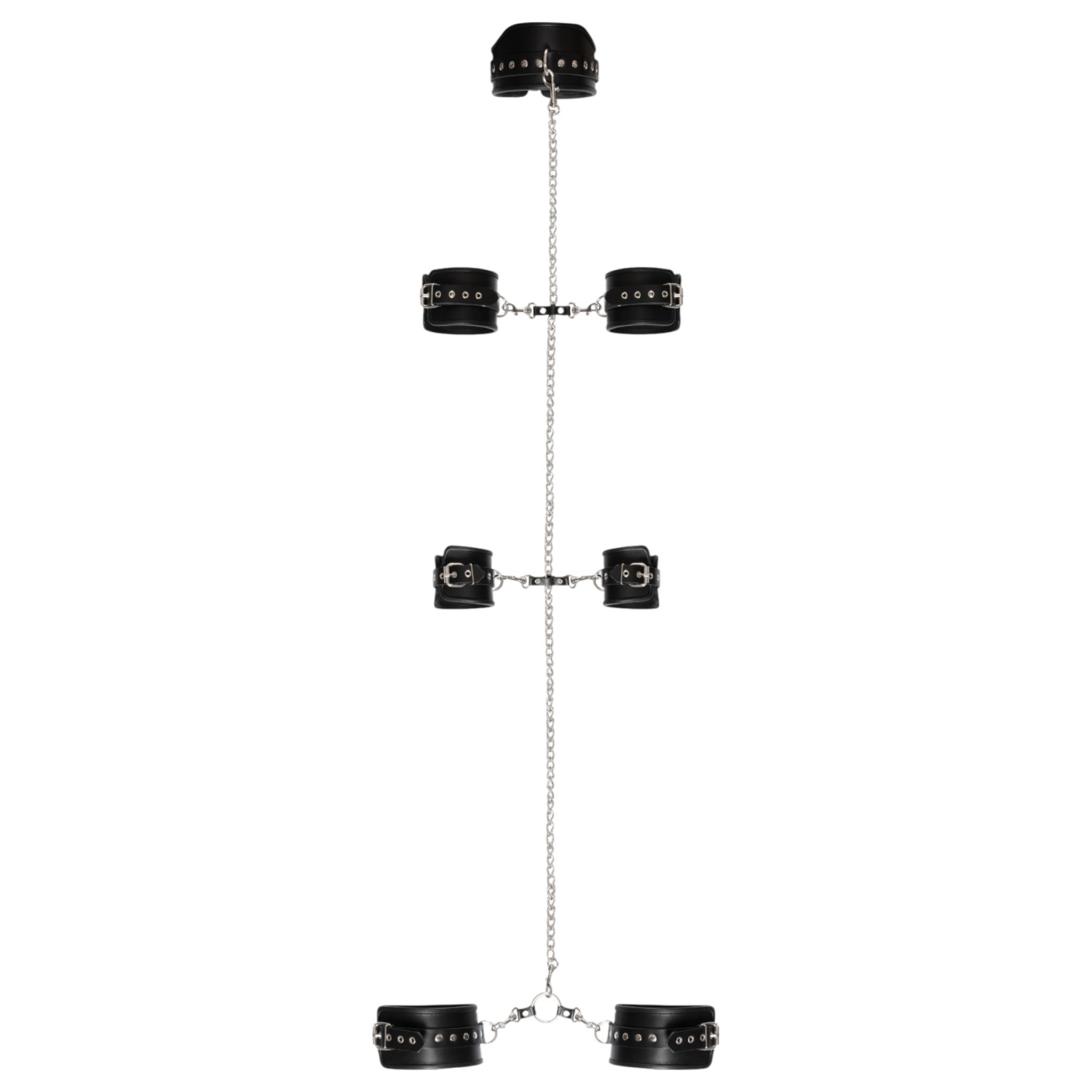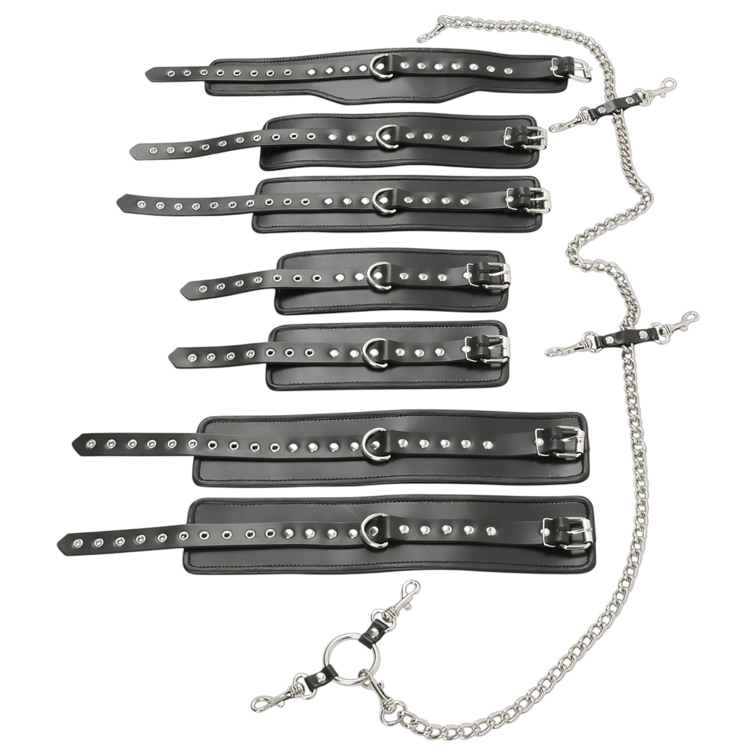 • Tailles réglables : Les menottes et le collier disposent de boucles métalliques ajustables pour s’adapter à toutes les morphologies.