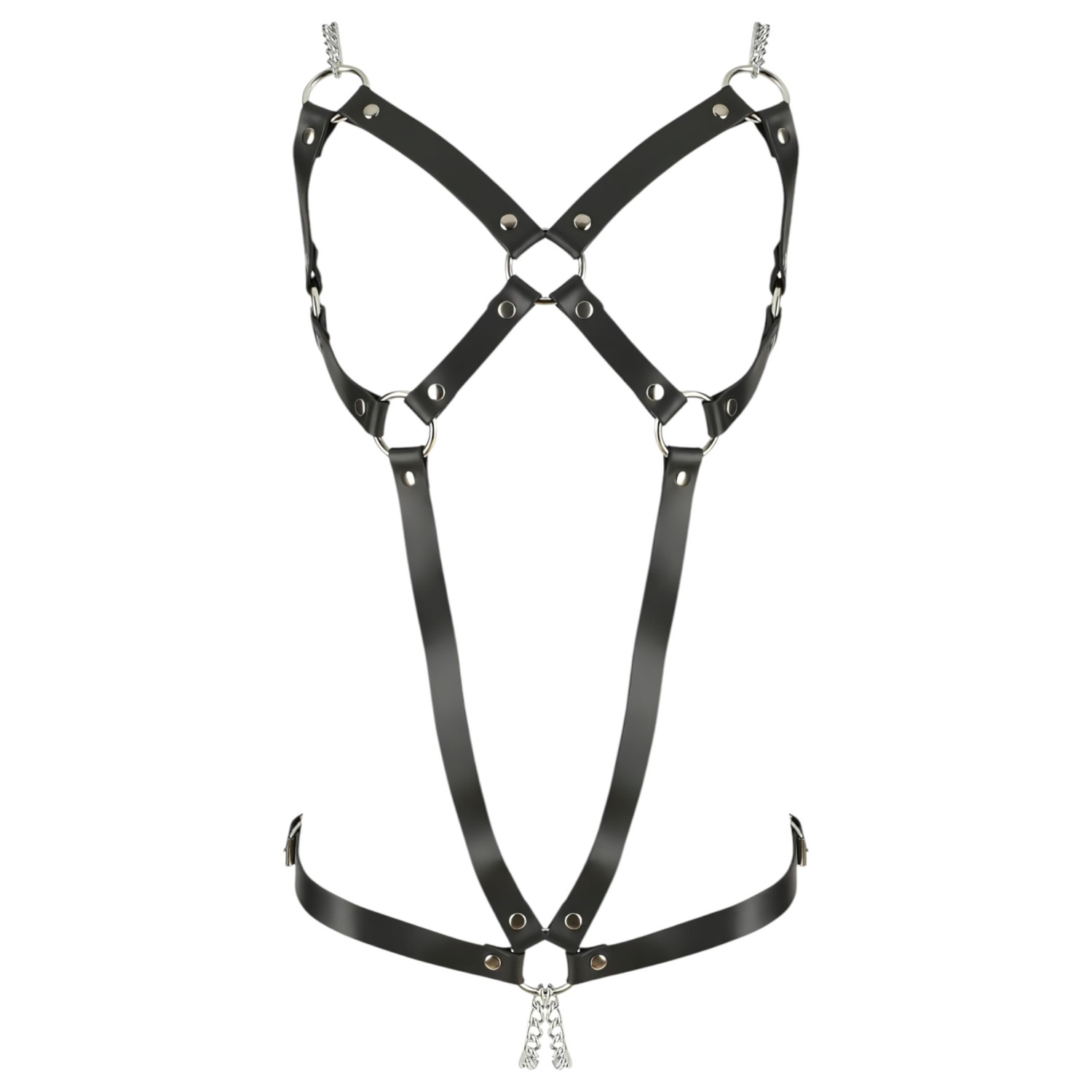 • 1 body noir en cuir, ouverture intime et bretelles chaînées.